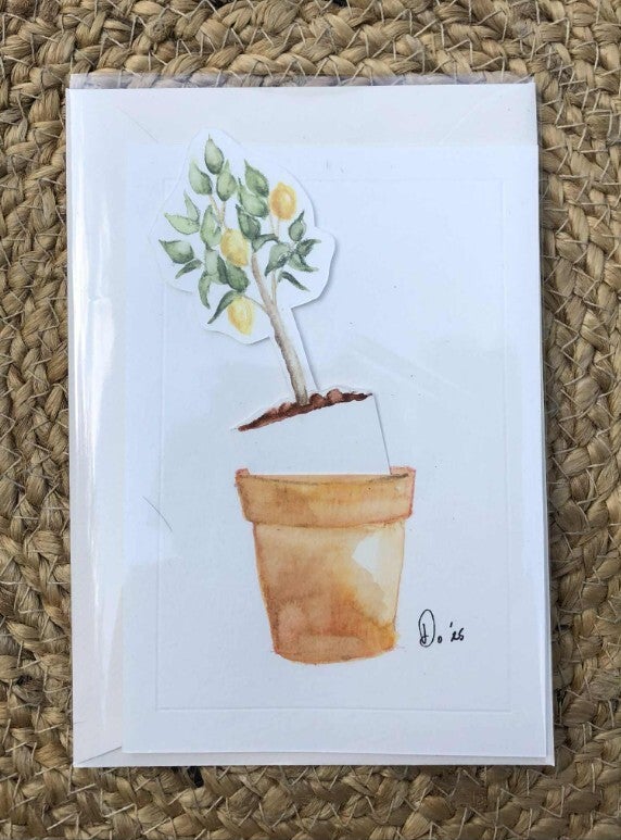 Laat iemand stralen met dit unieke kaartje waarin een sierlijke citronnier centraal staat. De plant lijkt uit de pot te groeien maar wie goed kijkt, ontdekt een verrassend detail: de boom kan voorzichtig uit de pot worden gehaald, om een verborgen boodschap te onthullen.